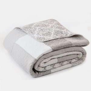 Patchwork quilt in shades of white and grey with a lace decorative detail