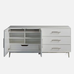 Striking a stunning asymmetrical balance, the Lane Dresser brings a modern lightness to interiors with a cool white finish, sleekly refined bar hardware and subtle textural detailing.
